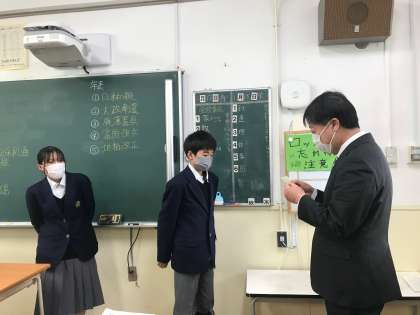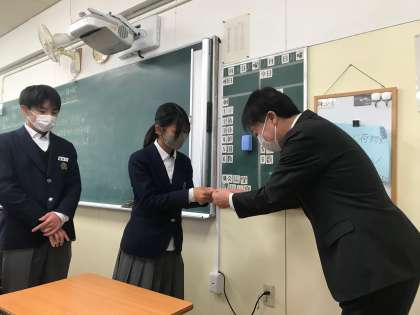 「人の命は地球の未来」の衛生委員会の皆さんが、昨年末に受講した普通救命講習の修了証が届きました。全校集会では代表生徒の分を読み上げただけなので、2年生の各教室を回ってお渡ししました。