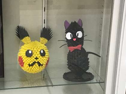 玄関のショーケースに折り紙で作ったピカチューとジジがいます。