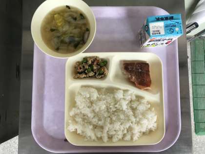 今日のメニューは「あかうおのレモン醤油掛け・高野豆腐の炒り煮・薄葛汁(うすくずじる)・ご飯・牛乳」の5品です。