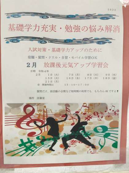 テスト1週間前です。今日からテスト前日の21日(月)までの放課後、図書室で元気アップ学習会をします。