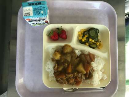 今日のメニューは「チキンレバーカレーライス(ご飯)・きゅうりとコーンのサラダ・いちご・牛乳」の4品です。