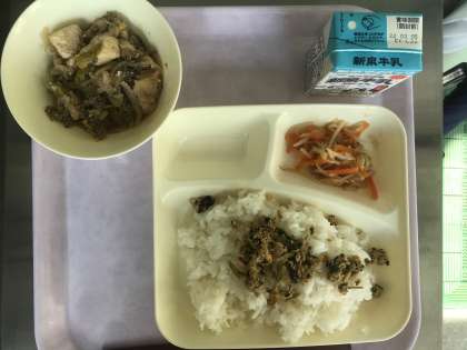 今日のメニューは「すき焼き煮・もやしと人参の甘酢和え・ツナっ葉炒め・ご飯・牛乳」の5品です。