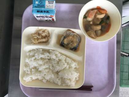 今日のメニューは「一口がんもと里芋の味噌煮・さごしのおろし醤油かけ・もやしの柚子の香和え・ご飯・牛乳」の5品です。