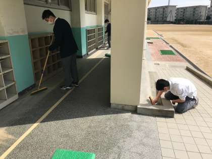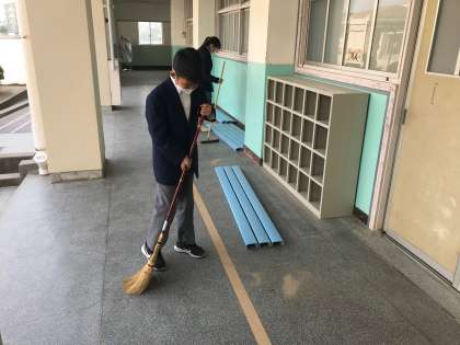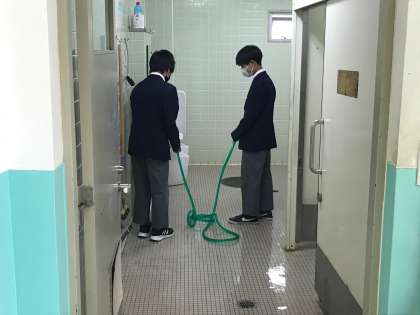 1年生が体育館から武道場までの廊下やトイレなどの掃除をしています。