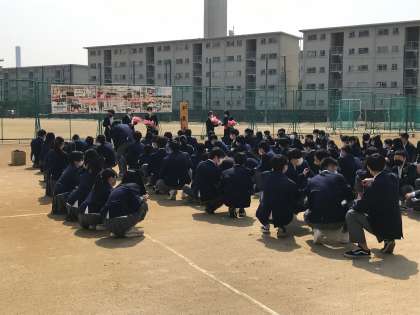 テニスコートに集合して写真撮影時の諸注意を聞きます。