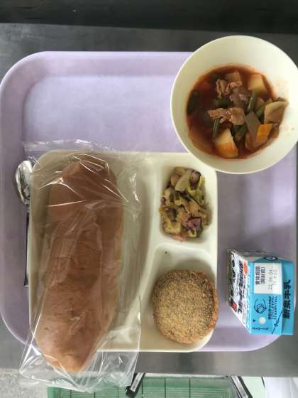 今日のメニューは「ケチャップ煮・チキンレバーカツ・たことキャベツのバジルソテー・黒糖パン・牛乳」の5品です。