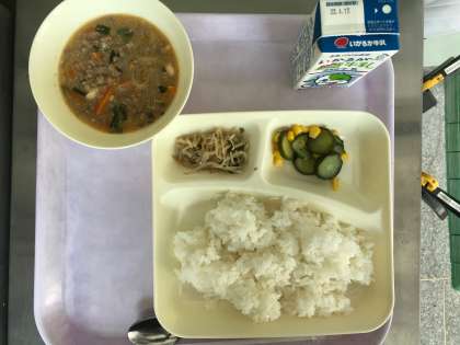 今日のメニューは「麻婆(マーボー)豆腐・きゅうりとコーンの甘酢和え・もやしとピーマンのごま炒め・ご飯・牛乳」の5品です。