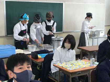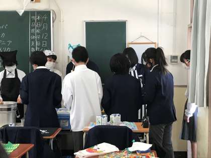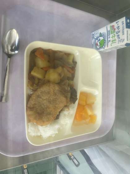 今日のメニューは、入学お祝い献立「カツカレーライス(ご飯)・フルーツゼリー・牛乳」の3品です。