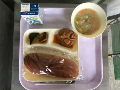 今日のメニューは「煮込みハンバーグ・コーンとキャベツのスープ・焼きカボチャ・黒糖パン・牛乳」の5品です。