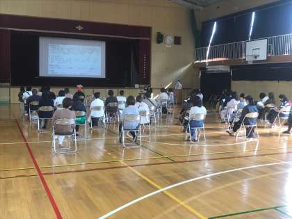 15時より、1年は多目的室、2年は体育館において、それぞれ一泊移住保護者説明会を対面&オンラインで開催しました。
