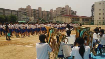最後に吹奏楽部の演奏で入場行進の後、開会式の練習をして今日の予行を終わりました。蒸し暑い中、生徒たちは最後までよく頑張っていました。天気予報では、明日の午後から雨が降り始め、未明には雨が上がりその後ゆっくり回復する見込みです。運動場の水はけが悪いため、当日の朝の水抜きに時間がかかることが予想されます。予定の時間通り開始できない場合は、ホームページ、保護者メールでお知らせします。保護者・来賓の皆さまには、悪しからずご理解いただきますようお願いします。