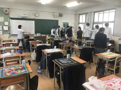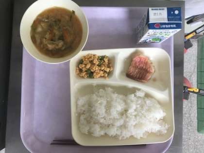 今日のメニューは「あかうおのしょうゆだれかけ・エンドウの卵とじ・ご飯・味噌汁・牛乳」の5品です。