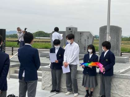 代表生徒による平和宣言、千羽鶴を捧げました。また、全員で黙祷しました。