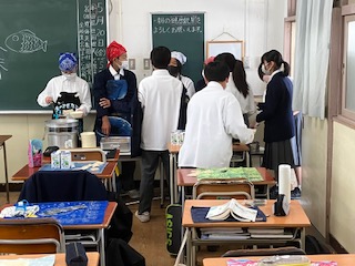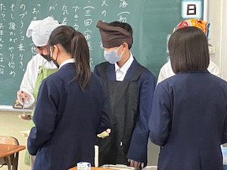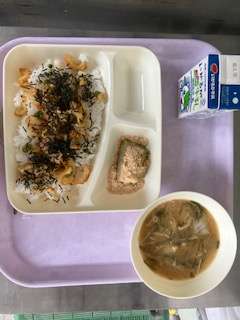 今日のメニューは「かやくご飯(機材海苔をかけて)・じゃがいもの味噌汁・抹茶外郎(ういろう)(きな粉をかけて)・牛乳」の4品です。