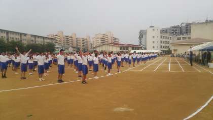 予定より少し遅れて体育大会を始めました。合同体操が終わりました。全学年の50m走が始まります。
