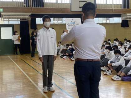 最初に陸上部走り幅跳び大阪市準優勝の3年生塩満輝さんの表彰を行いました。毎日努力を重ねて掴み取ったメダルは本当に価値あるもので、同時に仲間たちにも大きな勇気と自信を与えてくれるものとなりました。