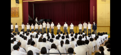 続いて、生徒議会のメンバーから創立50周年を記念して生徒全員で考えた校歌の4番の披露を行いました。みんなで元気よく唄うことでのお披露目となり、未来への希望いっぱいの素晴らしい校歌ができあがりました。