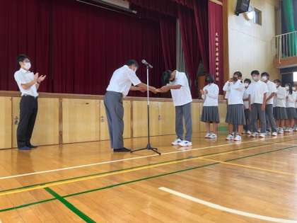 始業式に先立ち、部活動等で夏休み中にいただいた賞状の伝達を行いました。