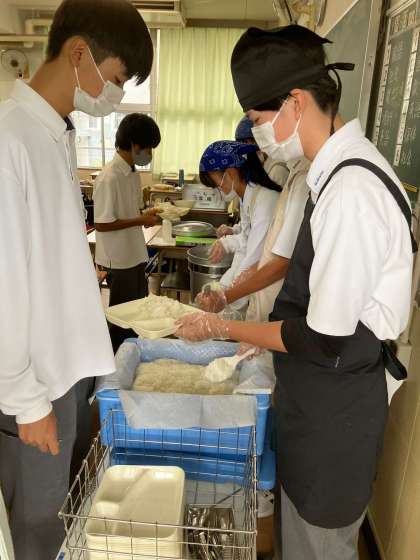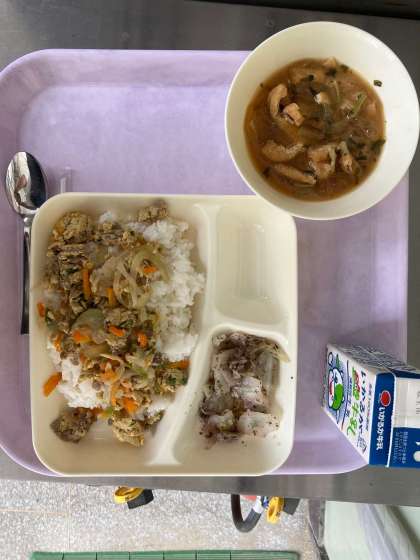 今日のメニューは「他人丼(ご飯)・冬瓜(とうがん)の味噌汁・キャベツの赤紫蘇和え・牛乳」の4品です。