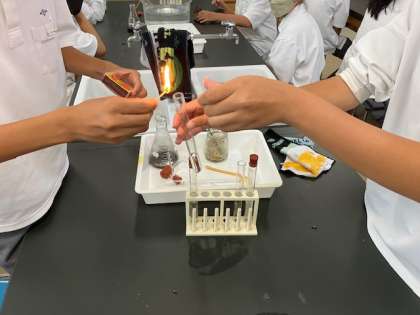 集めた気体が水素であることを確かめるためにマッチの火を近づけています。