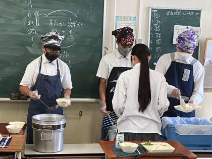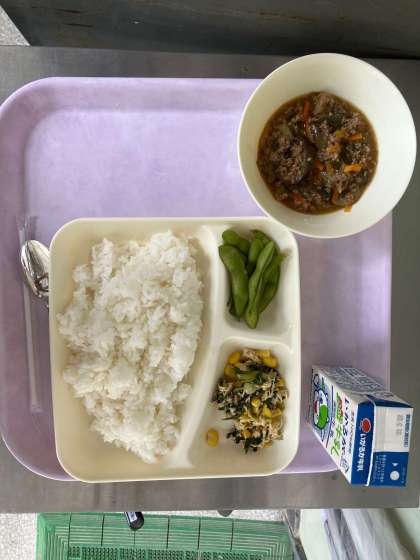 今日のメニューは「麻婆茄子(マーボーなす)・青梗菜とコーンの炒めもの・枝豆・ご飯・牛乳」の5品です。