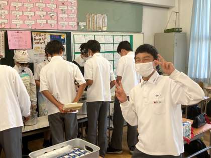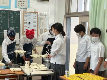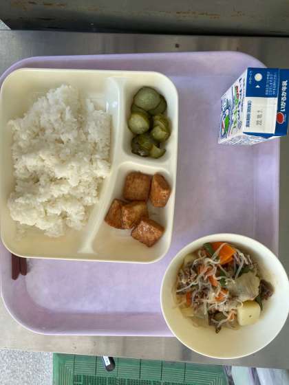 今日のメニューは「肉じゃが・厚揚げの味噌だれかけ・胡瓜(きゅうり)の柚子(ゆず)の香和え・ご飯・牛乳」の5品です。