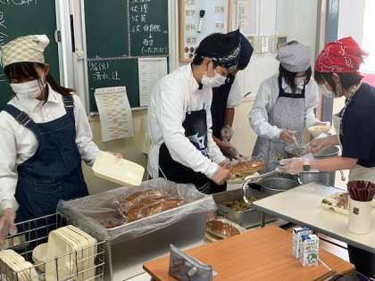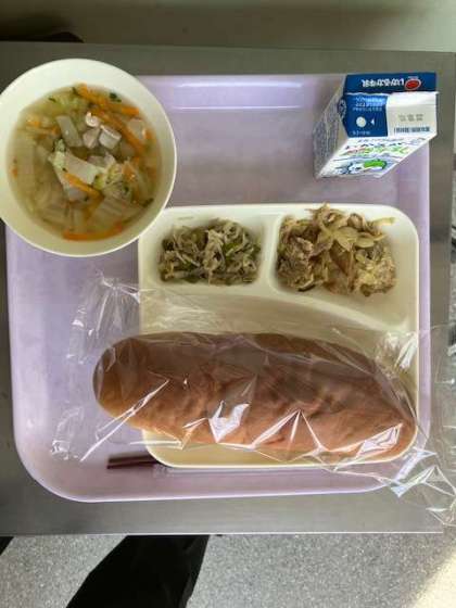 今日のメニューは「豚肉のカレー風味焼き・白菜のスープ・もやしとピーマンの炒め物・黒糖パン・牛乳」の5品です。