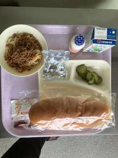 今日のメニューは「タンタンめん・胡瓜の甘酢漬け・ミニフィッシュ・発酵乳・コッペパン(アプリコットジャムをつけて)・牛乳」の5品です。