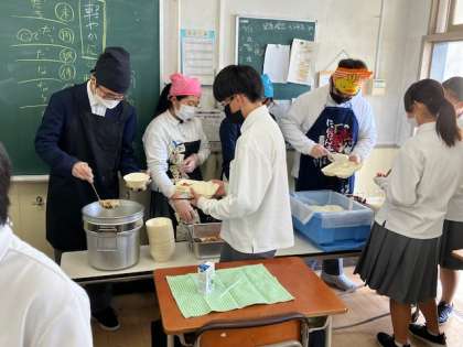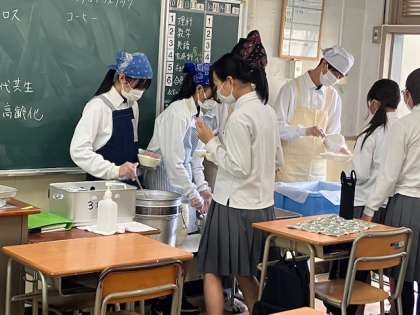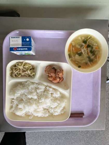 今日のメニューは「鶏肉のチリソース焼き・焼き豚とワンタンの皮のスープ・切り干し大根の胡麻(ごま)辛みづけ・ご飯・牛乳」の5品です。