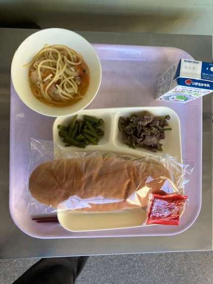 今日のメニューは「牛肉の香味焼き・ほたて貝とトマトのスープスパゲッティ・さんど豆のサラダ・コッペパン(いちごジャムをつけて)・牛乳」の5品です。