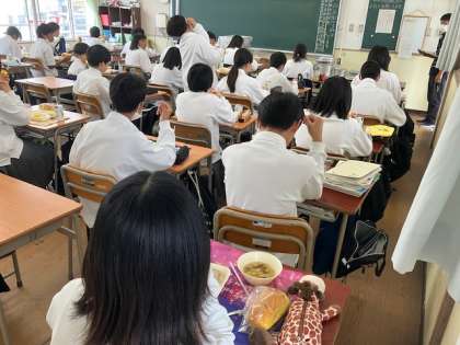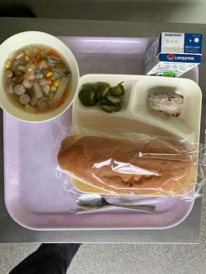 今日のメニューは「かつおのマリネ焼き(ノンエッグドレッシング)・ウインナーとじゃがいものスープ・きゅうりのサラダ・パンプキンパン・牛乳」の5品です。