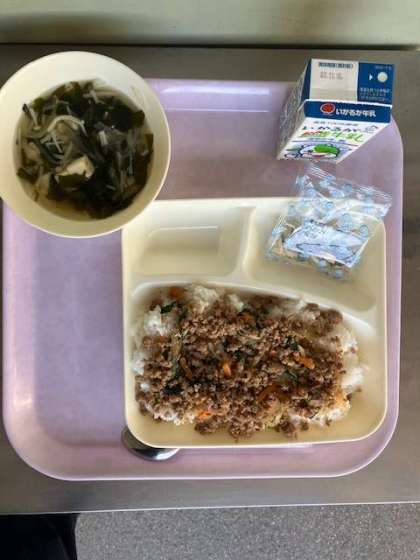 今日のメニューは「ビビンバ(ご飯)・わかめスープ・アーモンドフィッシュ・牛乳」の4品です。