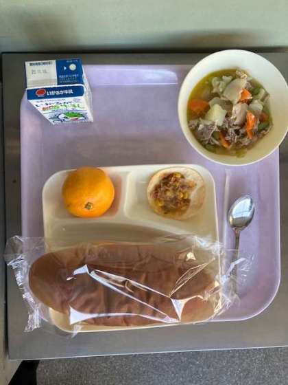 今日のメニューは「豚肉と野菜のスープ煮・変わりピザ・みかん・黒糖パン・牛乳」の5品です。