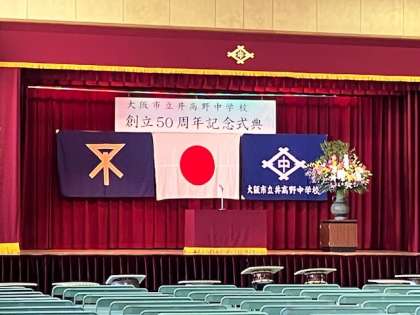 全校生徒・全教職員・事業委員会の皆さんとで「大阪市立井高野中学校 創立50周年記念式典」を挙行いたしました。