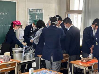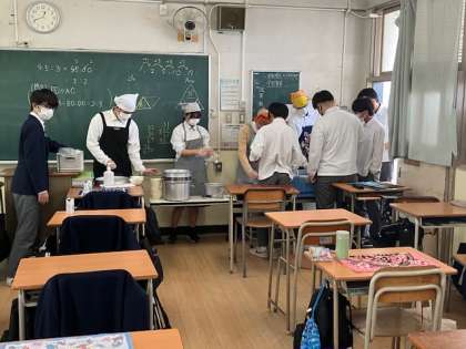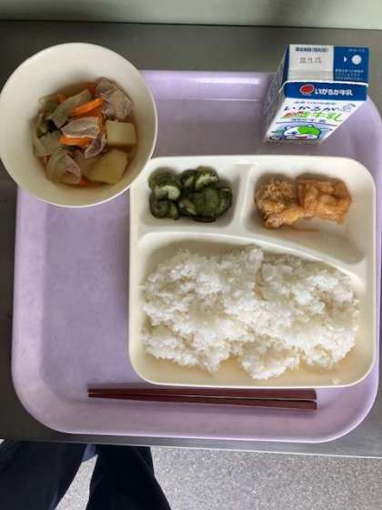 今日のメニューは「揚げ鶏の葱(ねぎ)だれかけ・豚肉とじゃがいもの煮物・胡瓜の赤紫蘇和え・ご飯・牛乳」の5品です。