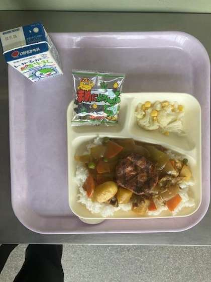 今日のメニューは「ハンバーグカレーライス(ご飯)・カリフラワーのピクルス・豆昆布(こんぶ)・牛乳」の4品です。