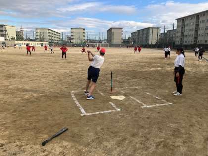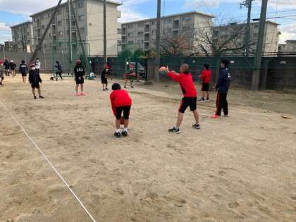 バットの代わりにバドミントンのラケットを使ってボールを打ちます。
