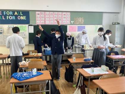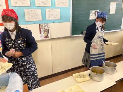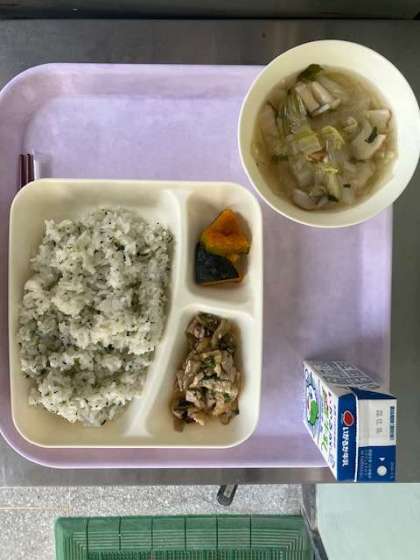 今日のメニューは「豚肉と干しずいきの味噌煮・薄くず汁・焼きかぼちゃの甘みつかけ・菜飯・牛乳」の5品です。