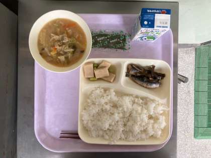 今日のメニューは「鰯の生姜煮・味噌汁・高野豆腐の煮物・焼き海苔・ご飯・牛乳」の6品です。