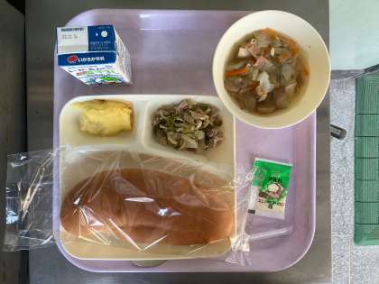 今日のメニューは「豚肉と野菜のソテー・スープ・スイートポテト・コッペパン(ソフトマーガリンをつけて)・牛乳」の5品です。
