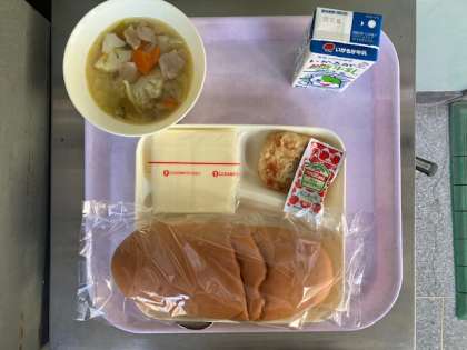 今日のメニューは「豆腐ハンバーグ・カリフラワーのスープ煮・スライスチーズ・黒糖パン・牛乳」の5品です。
