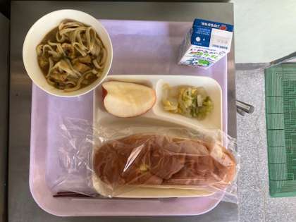 今年最後のメニューは「カレーうどん・白菜のお浸し・りんご・おさつパン・牛乳」の5品です。