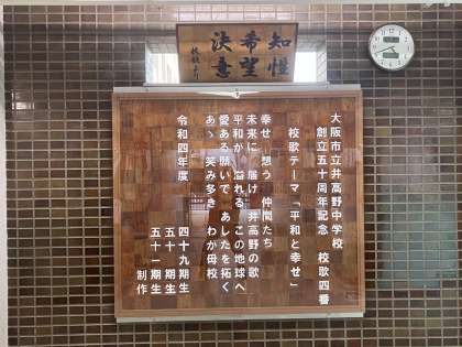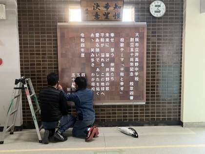 50周年記念として全校生徒が考えた いた中校歌 四番、そして、これまた全校生徒で役割分担して作った合体歌詞ボード、記念式典でお披露目して以来、倉庫に直していましたが、今日、工事をしていただいて、玄関に飾ることができました。