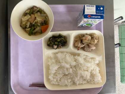 今日のメニューは「鶏肉の柚子塩焼き・厚揚げと野菜の煮物・小松菜の煮浸し・ご飯・牛乳」の5品です。