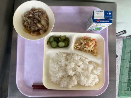 今日のメニューは「すき焼き煮・もやしとささみの炒め物・きゅうりのゆず風味・ご飯・牛乳」の5品です。