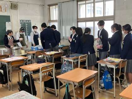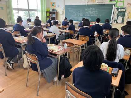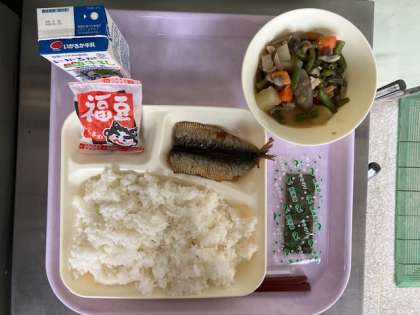 今日のメニューは節分の行事献立(鰯の生姜醤油かけ・含め煮・炒り大豆・焼き海苔・ご飯・牛乳」の6品です。