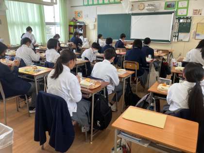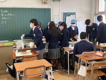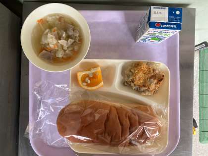 今日のメニューは「押麦のグラタン・豚肉と野菜のスープ・伊予柑・おさつパン・牛乳」の5品です。