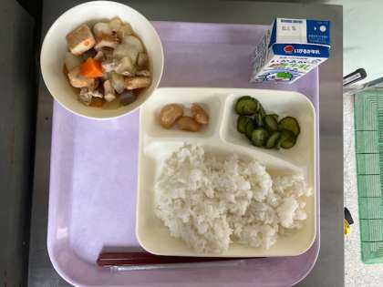 今日のメニューは「関東煮・きゅうりの梅風味・白花豆の煮もの・ご飯・牛乳」の5品です。