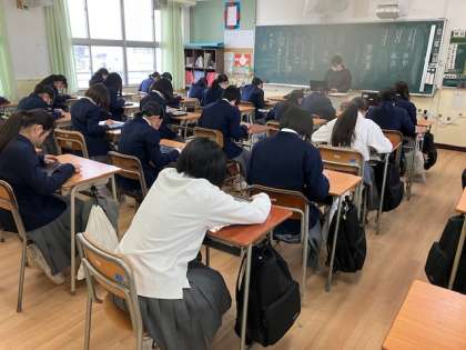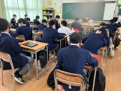 写真上)3・4組の男子、間もなく保健体育のテストです。