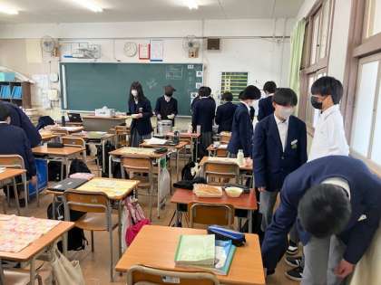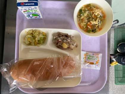 今日のメニューは「中華おこわ・卵スープ・キャベツのオイスターソース炒め・コッペパン(アプリコットジャムをつけて)・牛乳」の5品です。